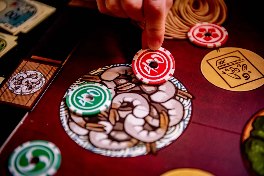 En Hibachi, los jugadores son chefs japoneses de teppanyaki que deben usar su parrilla hibachi para complacer a los clientes hambrientos. Para hacer esto, los jugadores se turnan en cada ronda para lanzar discos (fichas de póquer) al tablero. El lugar donde caen las patatas fritas determina qué ingredientes pueden comprar o vender los chefs y qué acciones especiales podrían tomar. Una a la vez, las ubicaciones en el tablero se resuelven a medida que se voltean las fichas para mostrar sus valores ocultos.