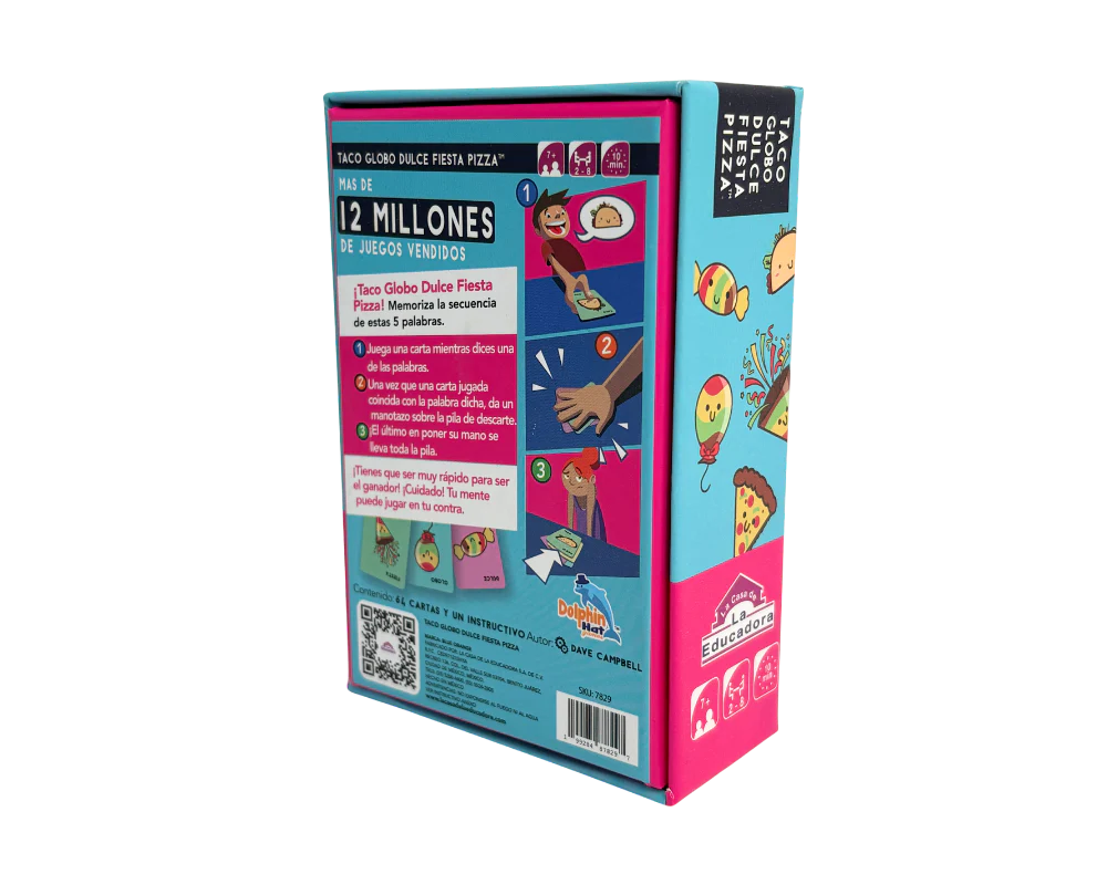 Taco Globo Dulce Fiesta Pizza es una edición especial del dinámico juego Taco, Gato, Cabra, Queso, Pizza, ahora con temática mexicana y tres cartas exclusivas que cambian el ritmo de la partida: el Pollito, que invita a cacarear y aletear; el Ajolote, que activa movimientos de nado únicos; y la Piñata, que desata una ronda de golpes ficticios como en una fiesta.