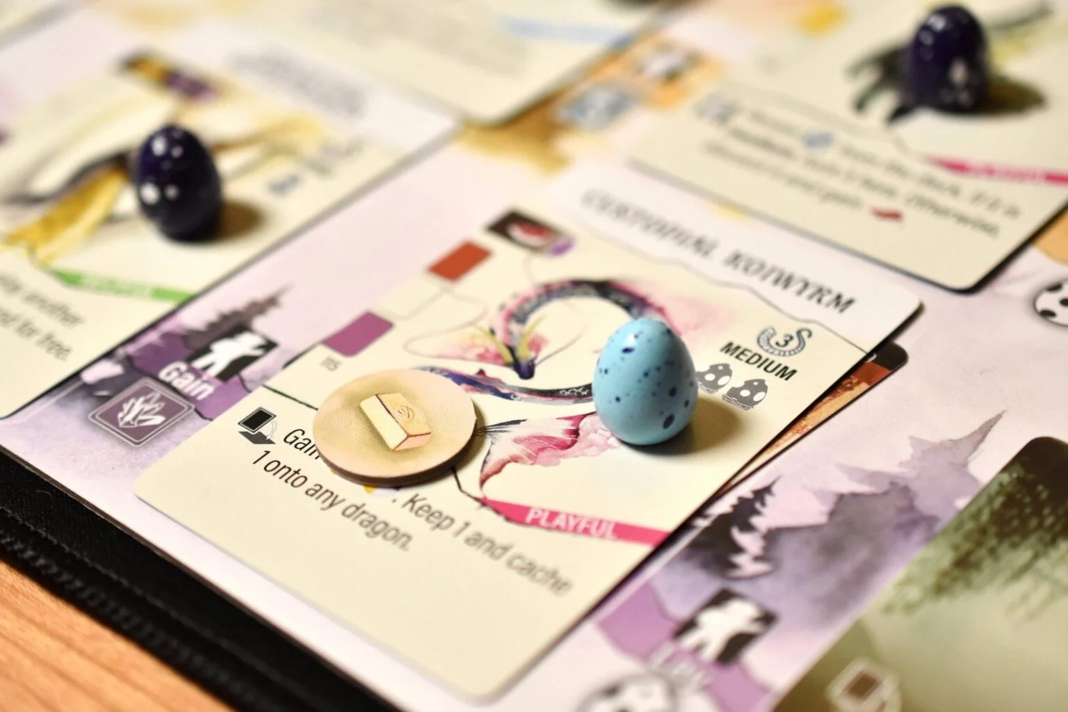 En Wyrmspan construirás un santuario para dragones. Durante la partida, excavarás más espacios en tu santuario y atraerás a dragones para que vivan en él, encadenando potentes habilidades y ganándote el favor del Gremio de los dragones.
